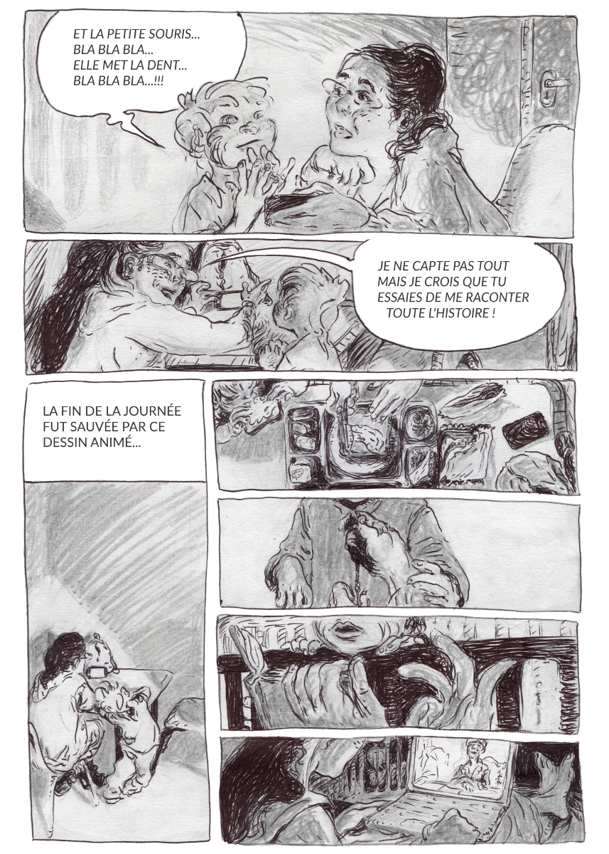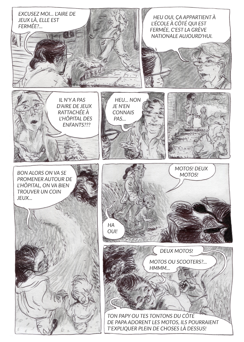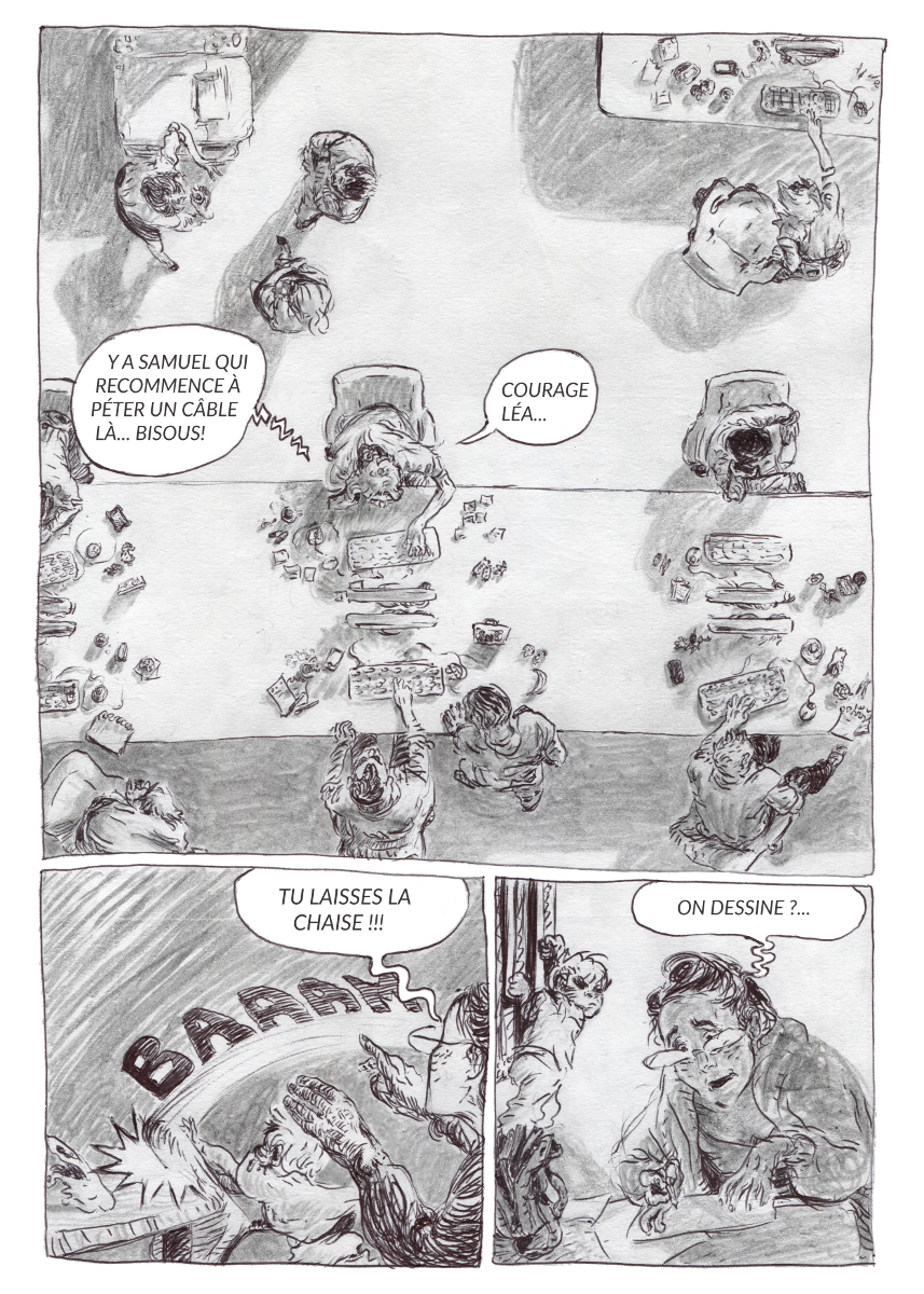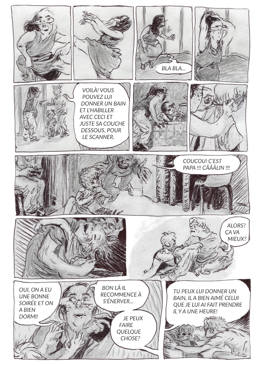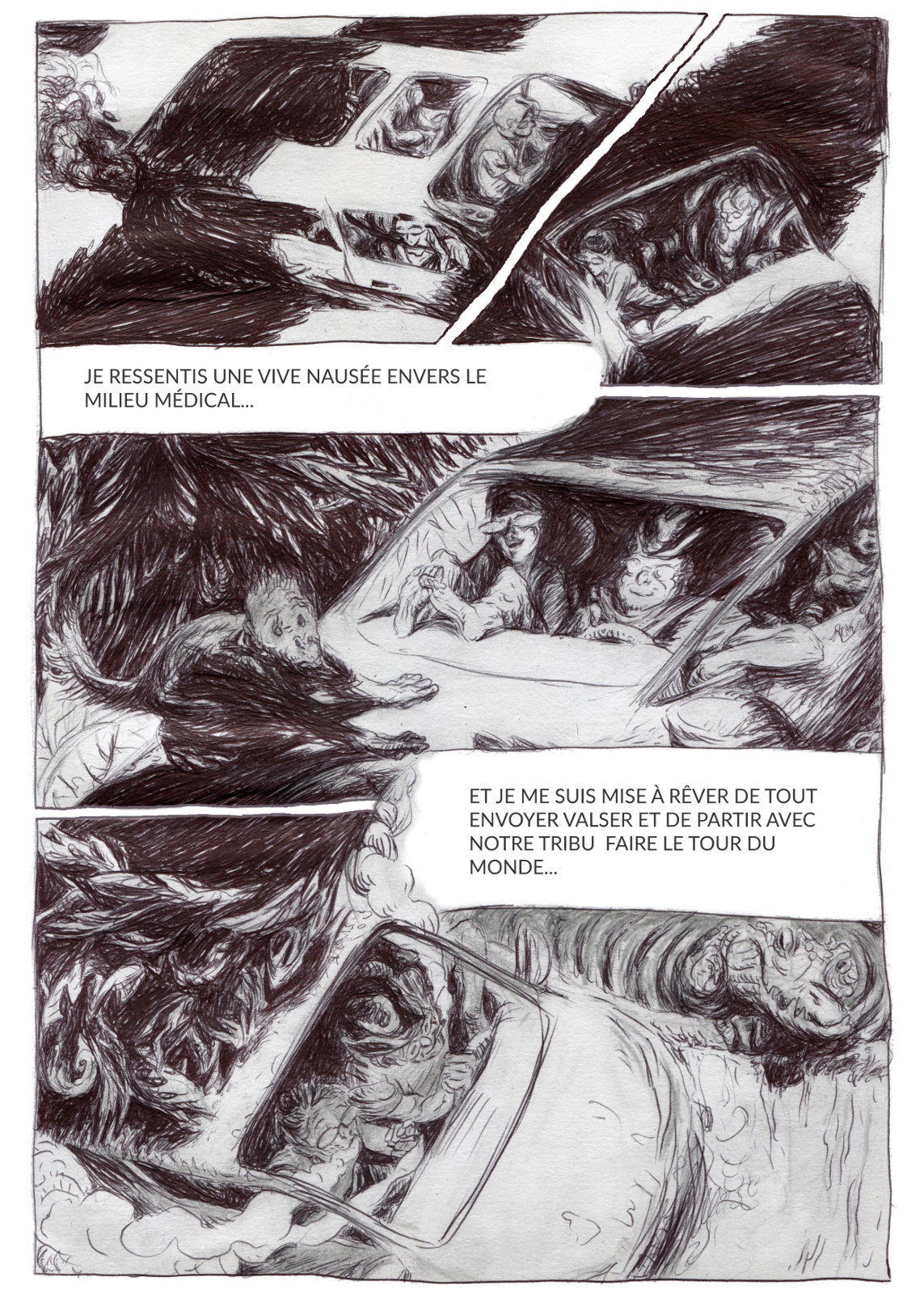 Je vous souhaite sincèrement de parvenir un jour à trouver le temps de reprendre le dessin, c’est effectivement dur au milieu d’enfants encore petits (vers la fin de ma bd on comprendra mieux comment je suis parvenue réellement à renouer avec le dessin, car le dessin nécessite + que du temps libre: il demande de pouvoir se pauser, de pouvoir se « calmer », pas toujours simple!). Dans mon cas à moi le retour au dessin m’était vital, et petit à petit les enfants intègrent de voir régulièrement leur maman dessiner sur la table à manger (enfin je reconnais que je suis interrompue très souvent et j’ai choisi des outils, stylo bic et mine de plomb, faciles à installer et à débarrasser lors des assauts des enfants). Mes jumeaux vont 3 jours par semaine chez une nounou (quand ils ne sont pas malades bien sur) et l’aîné de 4 ans est scolarisé à l’école à côté de chez nous.On a cette chance d’être tombé sur une école (normale) qui pour l’instant est sous le charme de notre fiston et l’investit énormément, on reste confiant pour la maternelle en tout cas, le primaire sera une autre aventure…Du coup j’arrive à avoir du temps (je n’ai pas d’emploi), et je bataille pour maintenir ce temps libre qui m’est archi précieux. Votre évocation du Cri de Munch m’a fait sourire, je n’y avais pas du tout pensé alors qu’en fait la parallèle est évidente! Bonne continuation à vous aussi et je l’espère des chouettes dessins à venir sur votre chemin 🙂 (avant de pouvoir redessiner, je chantonnais et dansais chez moi toute seule, ça aussi ça m’avait beaucoup beaucoup aidée)