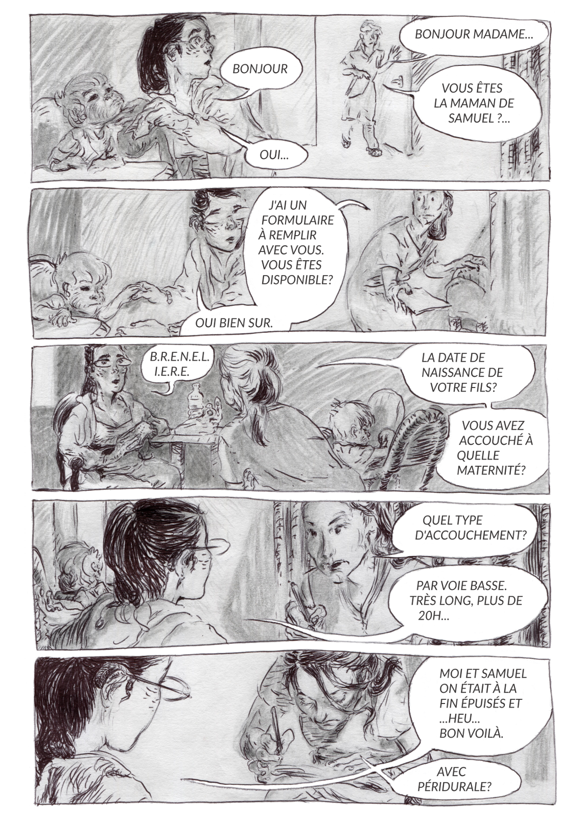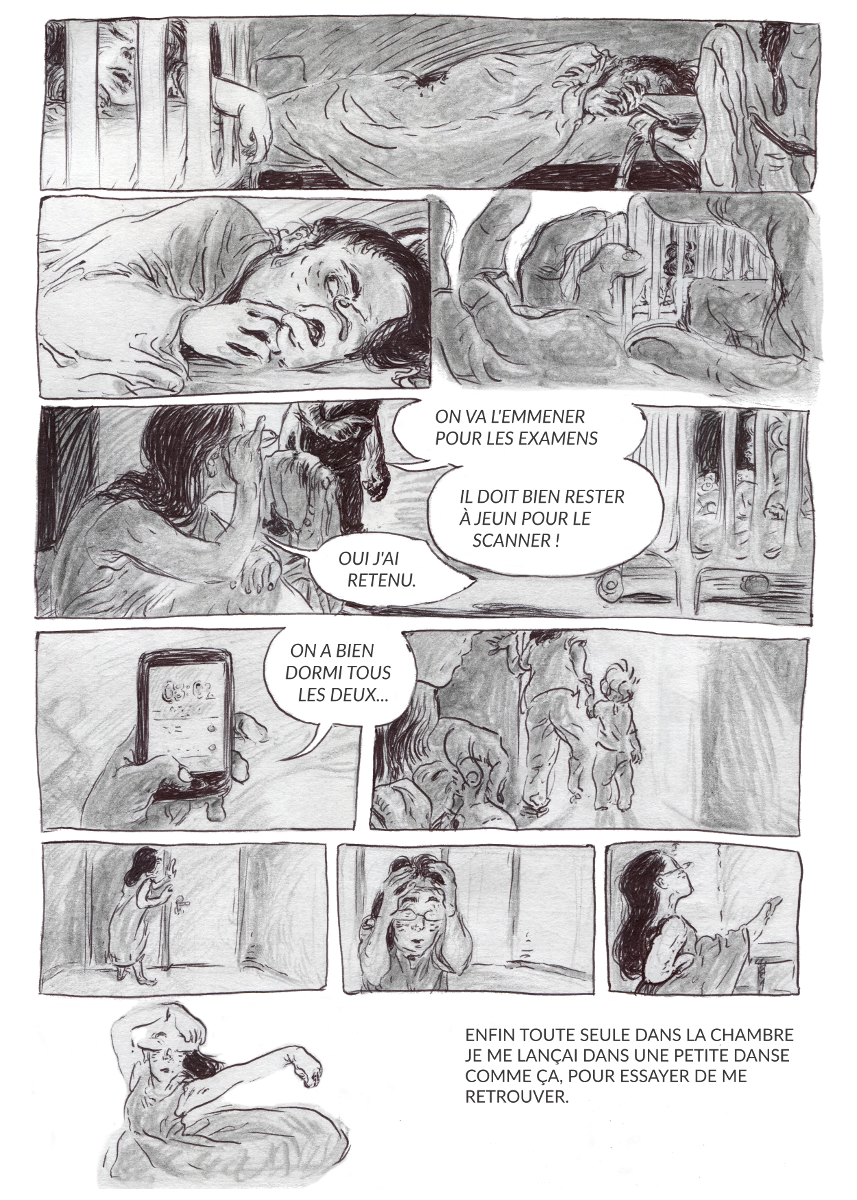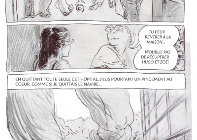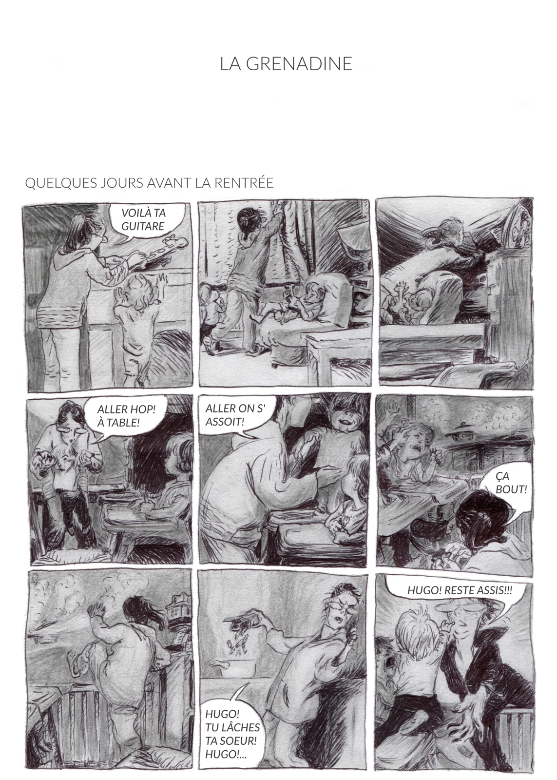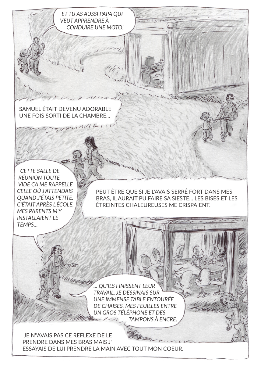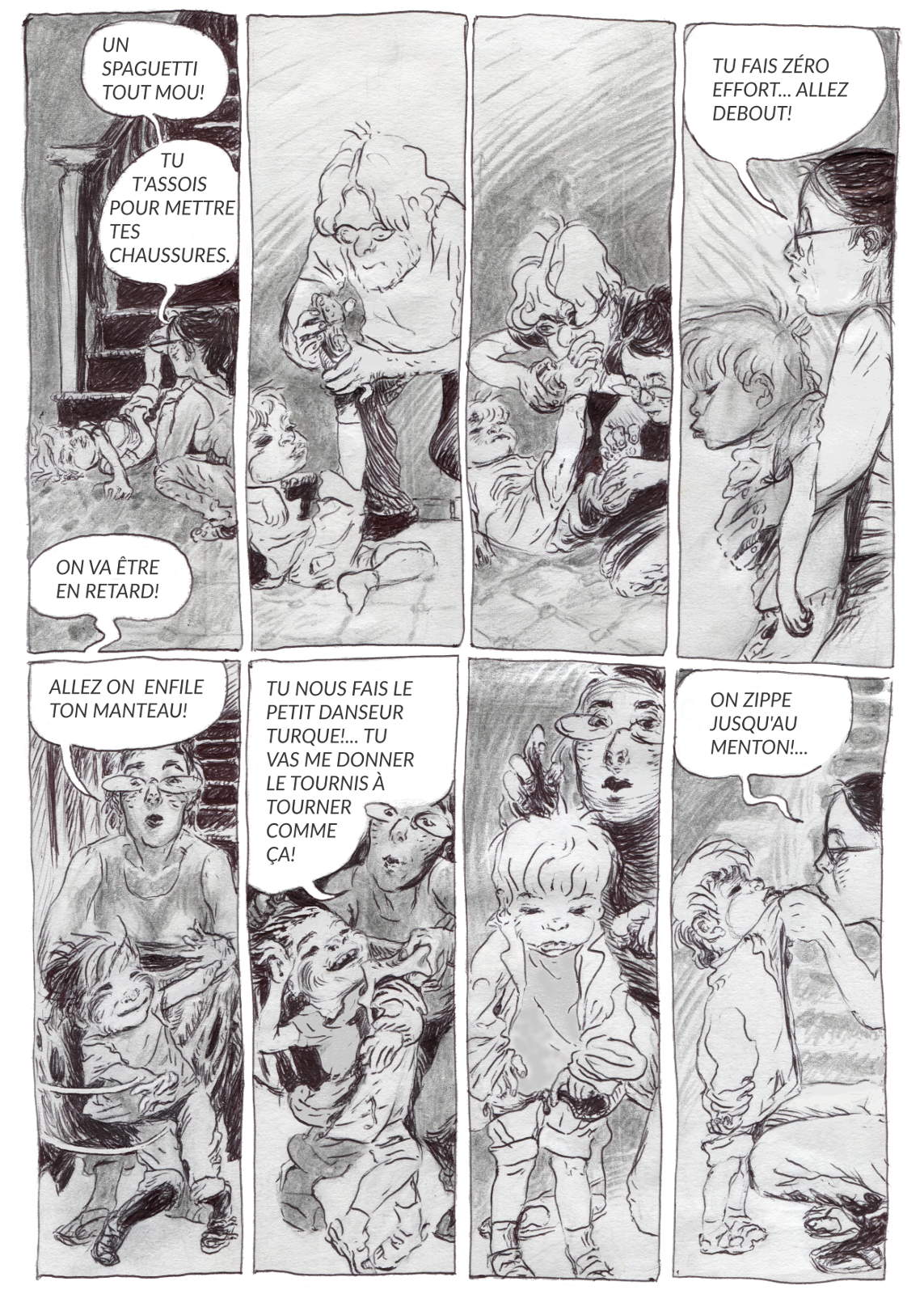 Je vous souhaite sincèrement de parvenir un jour à trouver le temps de reprendre le dessin, c’est effectivement dur au milieu d’enfants encore petits (vers la fin de ma bd on comprendra mieux comment je suis parvenue réellement à renouer avec le dessin, car le dessin nécessite + que du temps libre: il demande de pouvoir se pauser, de pouvoir se « calmer », pas toujours simple!). Dans mon cas à moi le retour au dessin m’était vital, et petit à petit les enfants intègrent de voir régulièrement leur maman dessiner sur la table à manger (enfin je reconnais que je suis interrompue très souvent et j’ai choisi des outils, stylo bic et mine de plomb, faciles à installer et à débarrasser lors des assauts des enfants). Mes jumeaux vont 3 jours par semaine chez une nounou (quand ils ne sont pas malades bien sur) et l’aîné de 4 ans est scolarisé à l’école à côté de chez nous.On a cette chance d’être tombé sur une école (normale) qui pour l’instant est sous le charme de notre fiston et l’investit énormément, on reste confiant pour la maternelle en tout cas, le primaire sera une autre aventure…Du coup j’arrive à avoir du temps (je n’ai pas d’emploi), et je bataille pour maintenir ce temps libre qui m’est archi précieux. Votre évocation du Cri de Munch m’a fait sourire, je n’y avais pas du tout pensé alors qu’en fait la parallèle est évidente! Bonne continuation à vous aussi et je l’espère des chouettes dessins à venir sur votre chemin 🙂 (avant de pouvoir redessiner, je chantonnais et dansais chez moi toute seule, ça aussi ça m’avait beaucoup beaucoup aidée)