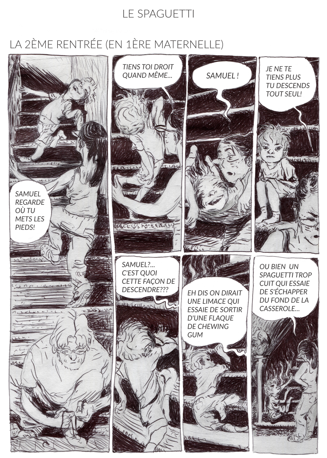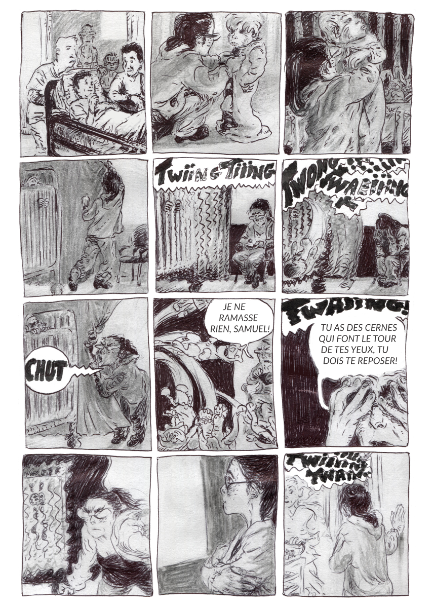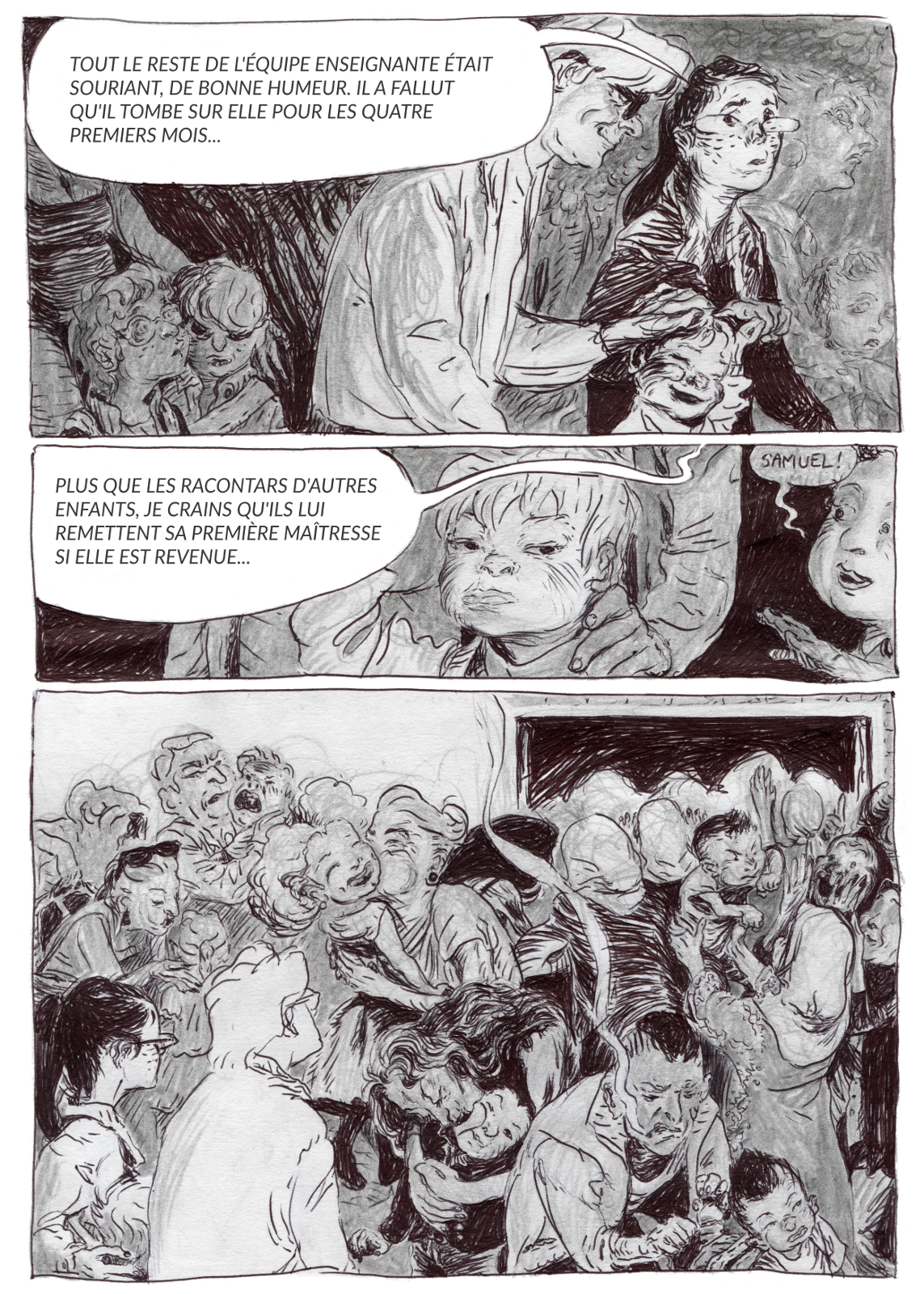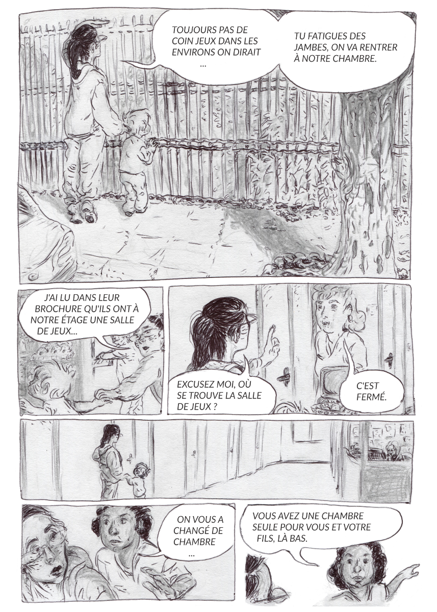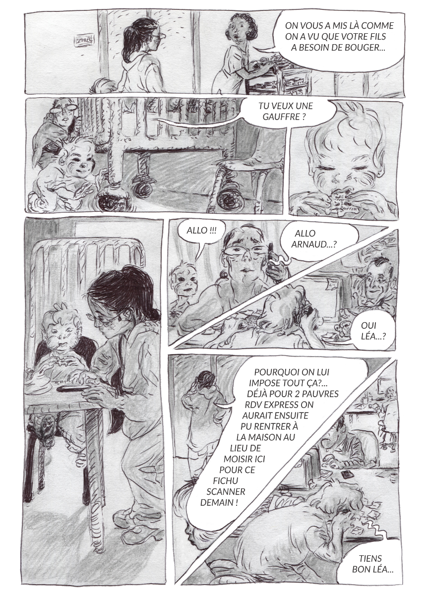 Je vous souhaite sincèrement de parvenir un jour à trouver le temps de reprendre le dessin, c’est effectivement dur au milieu d’enfants encore petits (vers la fin de ma bd on comprendra mieux comment je suis parvenue réellement à renouer avec le dessin, car le dessin nécessite + que du temps libre: il demande de pouvoir se pauser, de pouvoir se « calmer », pas toujours simple!). Dans mon cas à moi le retour au dessin m’était vital, et petit à petit les enfants intègrent de voir régulièrement leur maman dessiner sur la table à manger (enfin je reconnais que je suis interrompue très souvent et j’ai choisi des outils, stylo bic et mine de plomb, faciles à installer et à débarrasser lors des assauts des enfants). Mes jumeaux vont 3 jours par semaine chez une nounou (quand ils ne sont pas malades bien sur) et l’aîné de 4 ans est scolarisé à l’école à côté de chez nous.On a cette chance d’être tombé sur une école (normale) qui pour l’instant est sous le charme de notre fiston et l’investit énormément, on reste confiant pour la maternelle en tout cas, le primaire sera une autre aventure…Du coup j’arrive à avoir du temps (je n’ai pas d’emploi), et je bataille pour maintenir ce temps libre qui m’est archi précieux. Votre évocation du Cri de Munch m’a fait sourire, je n’y avais pas du tout pensé alors qu’en fait la parallèle est évidente! Bonne continuation à vous aussi et je l’espère des chouettes dessins à venir sur votre chemin 🙂 (avant de pouvoir redessiner, je chantonnais et dansais chez moi toute seule, ça aussi ça m’avait beaucoup beaucoup aidée)