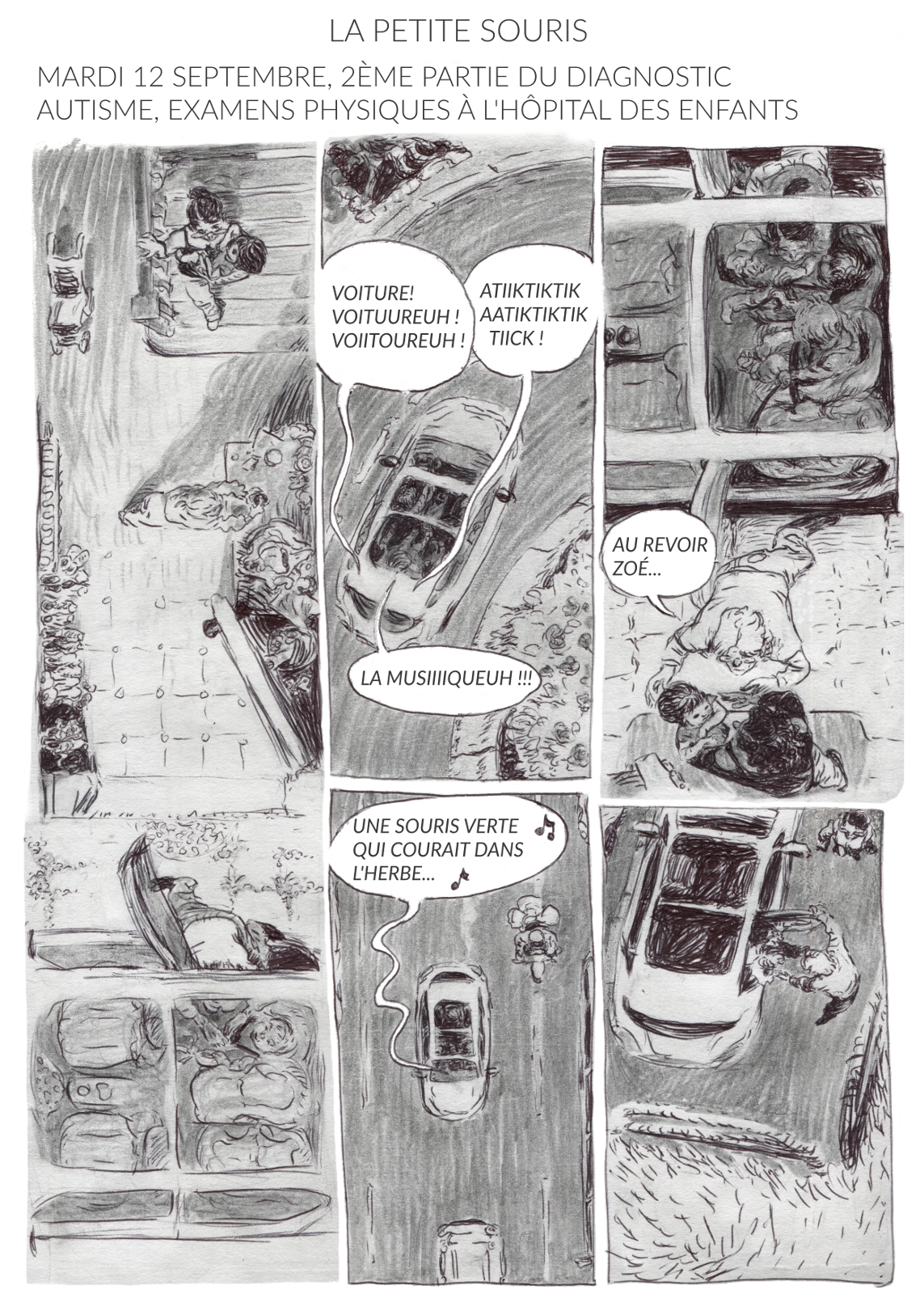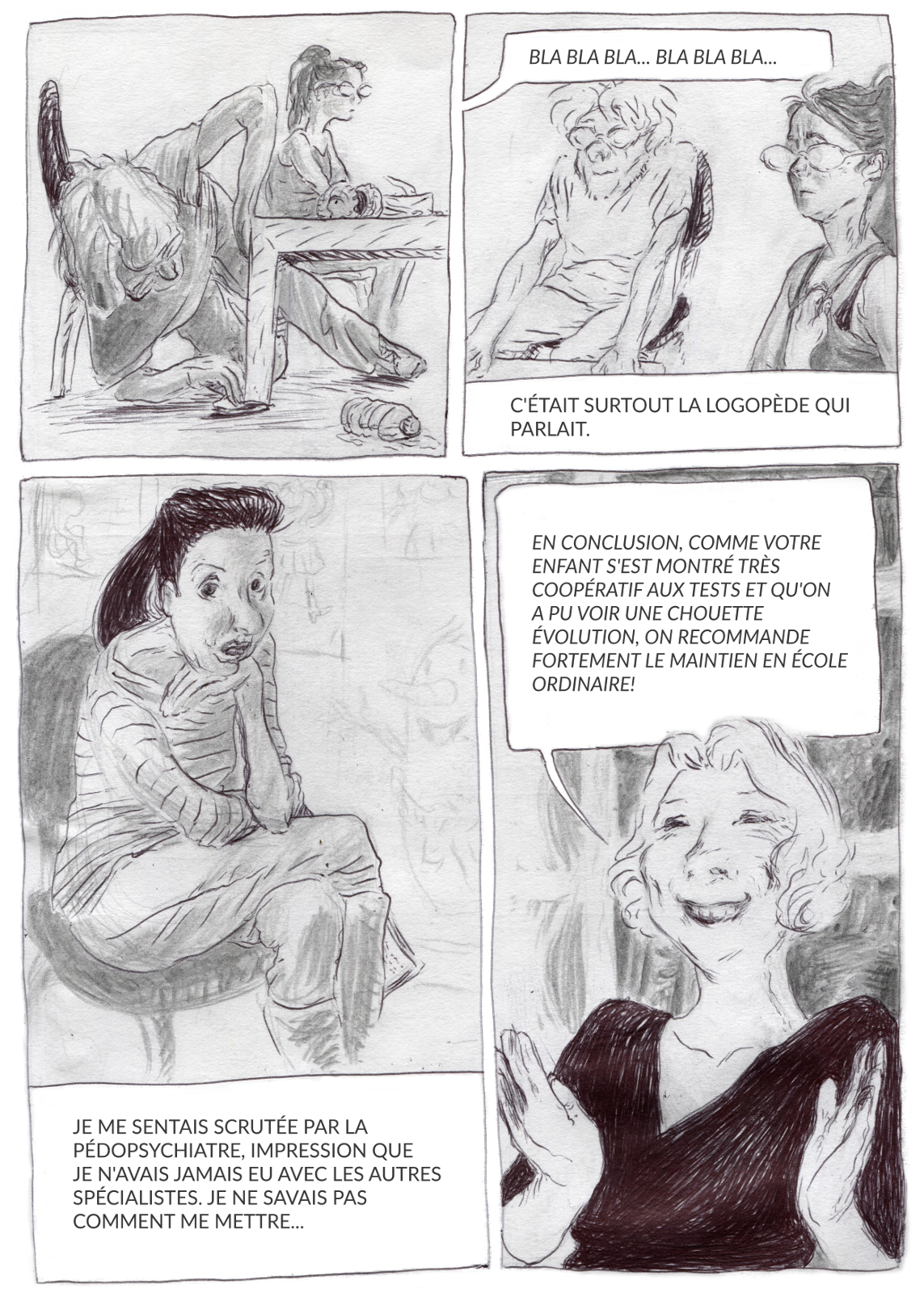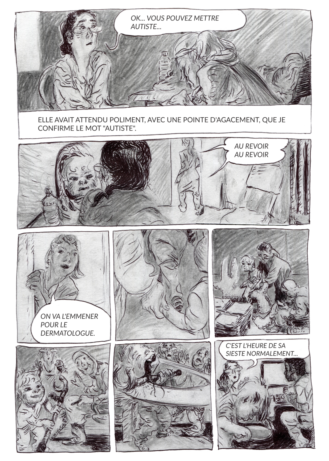 merci pour cette BD, je suis mère de deux filles dont l’ainée est autiste également, je reconnais toutes les situations que vous avez présenté et même si ce n’est pas une situation particulièrement souhaitable ça fait du bien de savoir qu’on n’est pas les seuls à vivre ce quotidien. Vous avez su montrer toutes ces émotions qui nous traversent parfois en tant que parent à travers un graphisme très vivant et expressif (ça m’a aussi fait pensé à « Le cri » de Munch…). J’aimerais également reprendre le dessin (études d’arts-appliqués et arts plastiques aussi), mais je ne sais pas comment trouver le temps, alors j’admire doublement votre travail parce que je sais que ce n’est pas évident d’avoir de la disponibilité avec un enfant qui n’est pas pris à l’école à temps plein et qui a beaucoup de rendez-vous à droite et à gauche (en plus d’un autre enfant en bas âge…alors deux…). Bonne continuation à vous 🙂