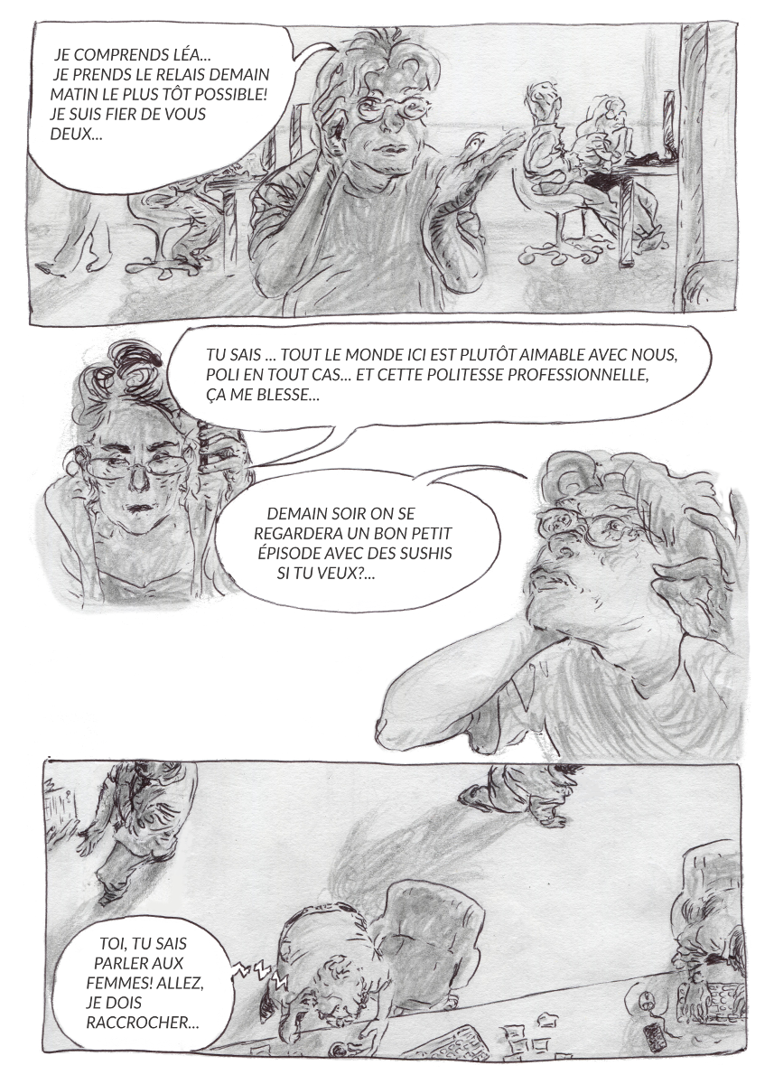 1. Coucou Je viens de lire cette BD. C ‘EST VRAIMENT FORMIDABLE. Les dessins sont d’une beauté et d’une précision incroyables. Tu as su saisir tes personnages, !je vous reconnais tous les deux. Et que de sensibilité dans ton texte ! BRAVO LÉA. Continue